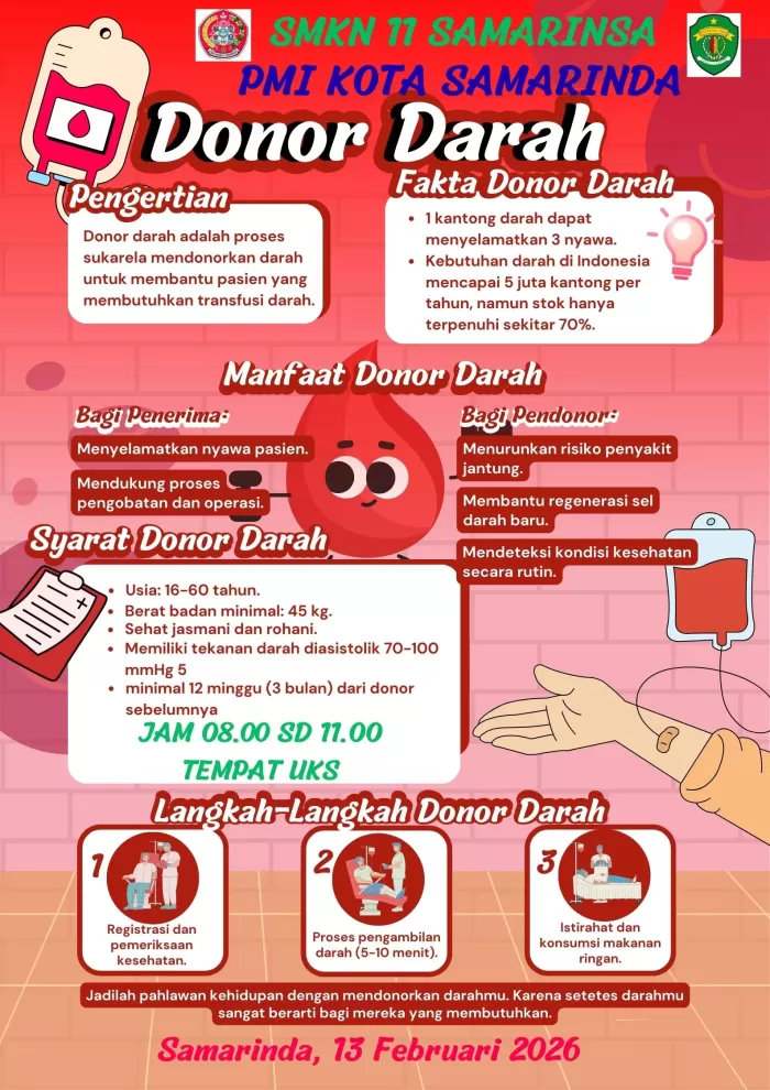 KEGIATAN DONOR DARAH PMR SMKN 11 SAMARINDA KERJASAMA DENGAN PMI 13 Feb 2026 Telah dibaca : 56 kali Bagikan ke : Facebook Twitter WhatsApp LinkedIn